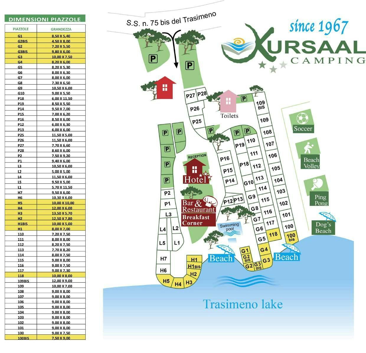 Terrain mostly covered by a little wood with tall pine trees, cypresses, and cedars, partly also on a flat meadow. Pitch areas mostly separated by hedges. Arranged around a hotel, between the lakeside road and the lake. Adjacent to a neighboring campsite. Railway line nearby, no train traffic at night.